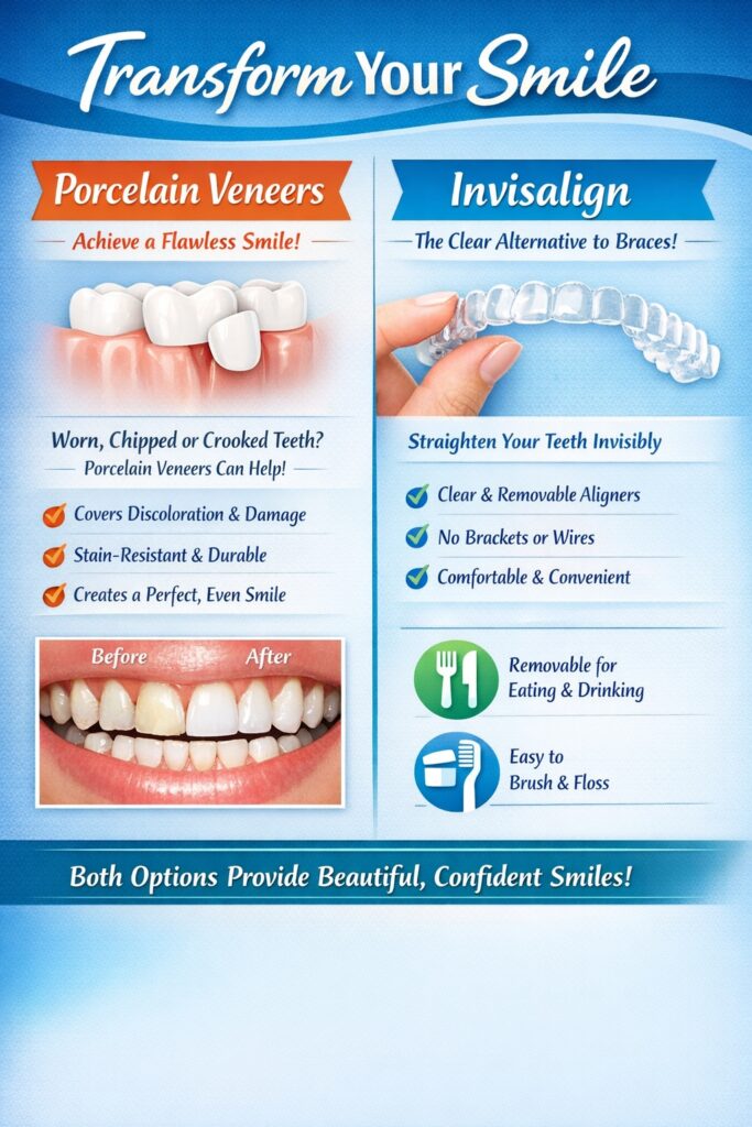Invisalign uses clear, custom-made aligners that are discreet and comfortable, offering a more flexible and nearly invisible alternative to traditional braces. Unlike metal braces, Invisalign is removable, making it easier to eat, brush, and floss.